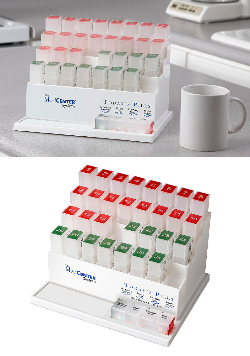 Fill the daily pill boxes with your medications and place them back in the organizer with the green ends pointing up. (Each daily pill box has the day of the month on one end green and on the other end in red.)