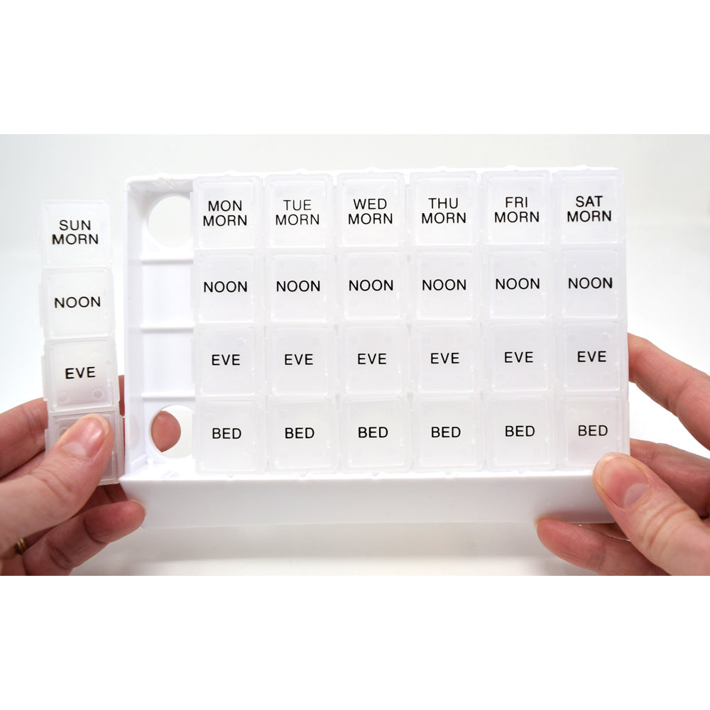 - EACH DAILY PILL BOX IS CLEARLY LABELED The 7 individual pill boxes each have 4 compartments that have their own separate snap close lid. Each Individual daily pill box is clearly labeled with the day of the week and each of the 4 compartments are labeled with a time of day. The print is large and easy to read.