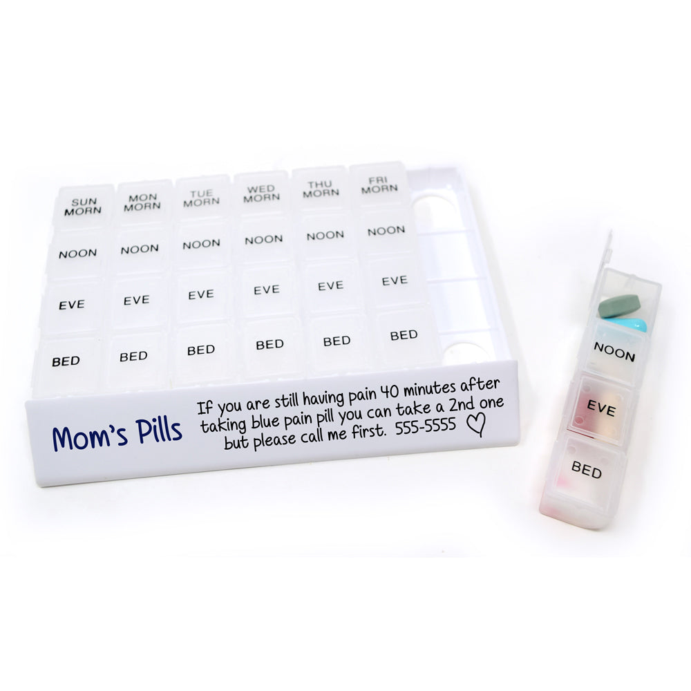 - PILL ORGANIZATION WITH A WRITABLE SURFACE - Use the slanted front area of the pill organizer tray to indicate whose pills they are, notes or instructions about the medications, reminder to take additional non-pill medications, or just a fun note to a loved one - right where they can see it.
