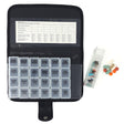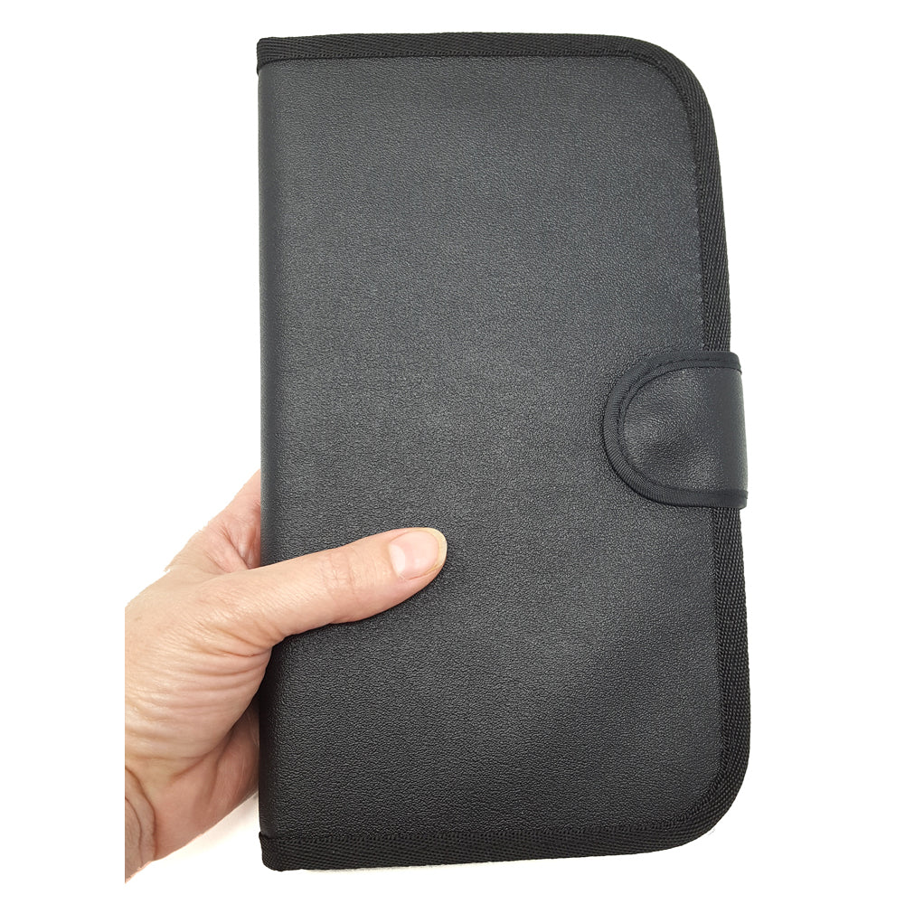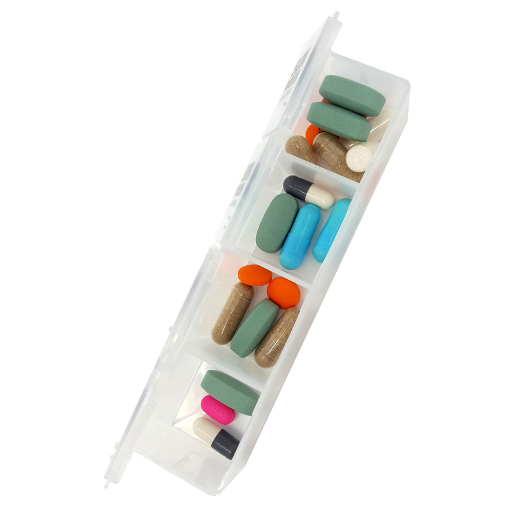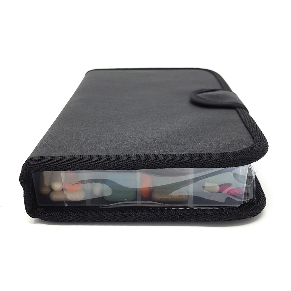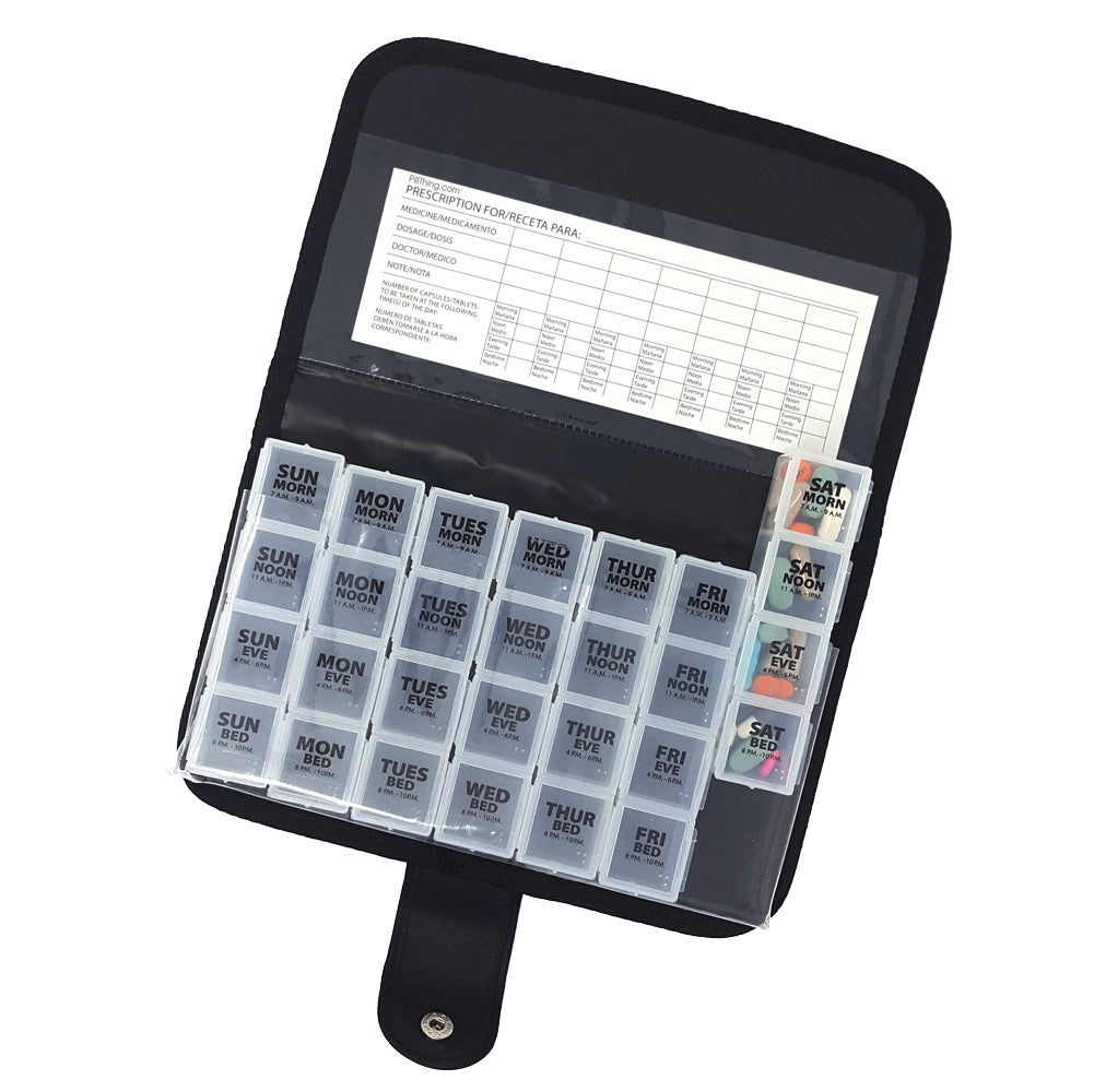 Attractive, discreet way to organize and carry medication. This black case with snap closure holds your medications for one week and has four compartments for each day of the week. There is also a clear pocket to hold medication instructions.