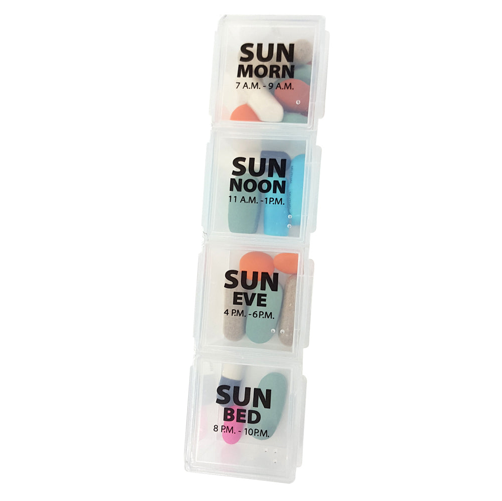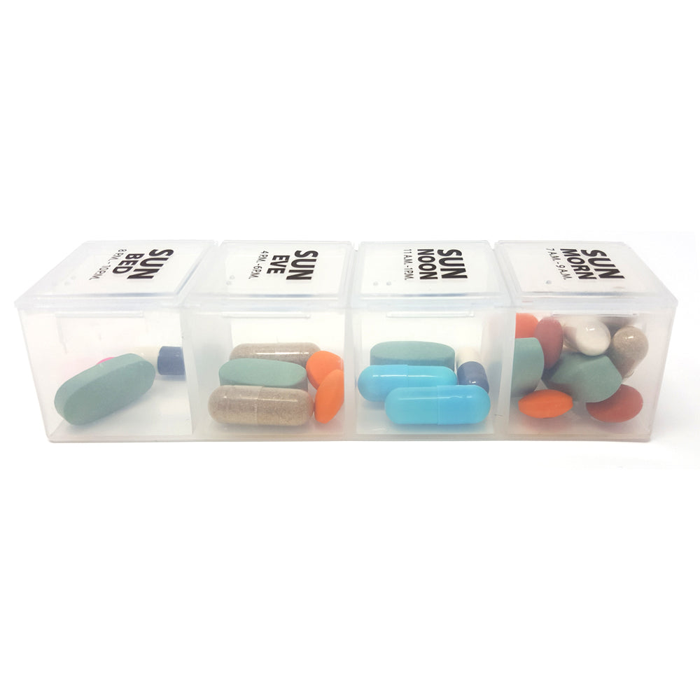 - Compartments labeled "morning", "noon", "eve", and "bed".