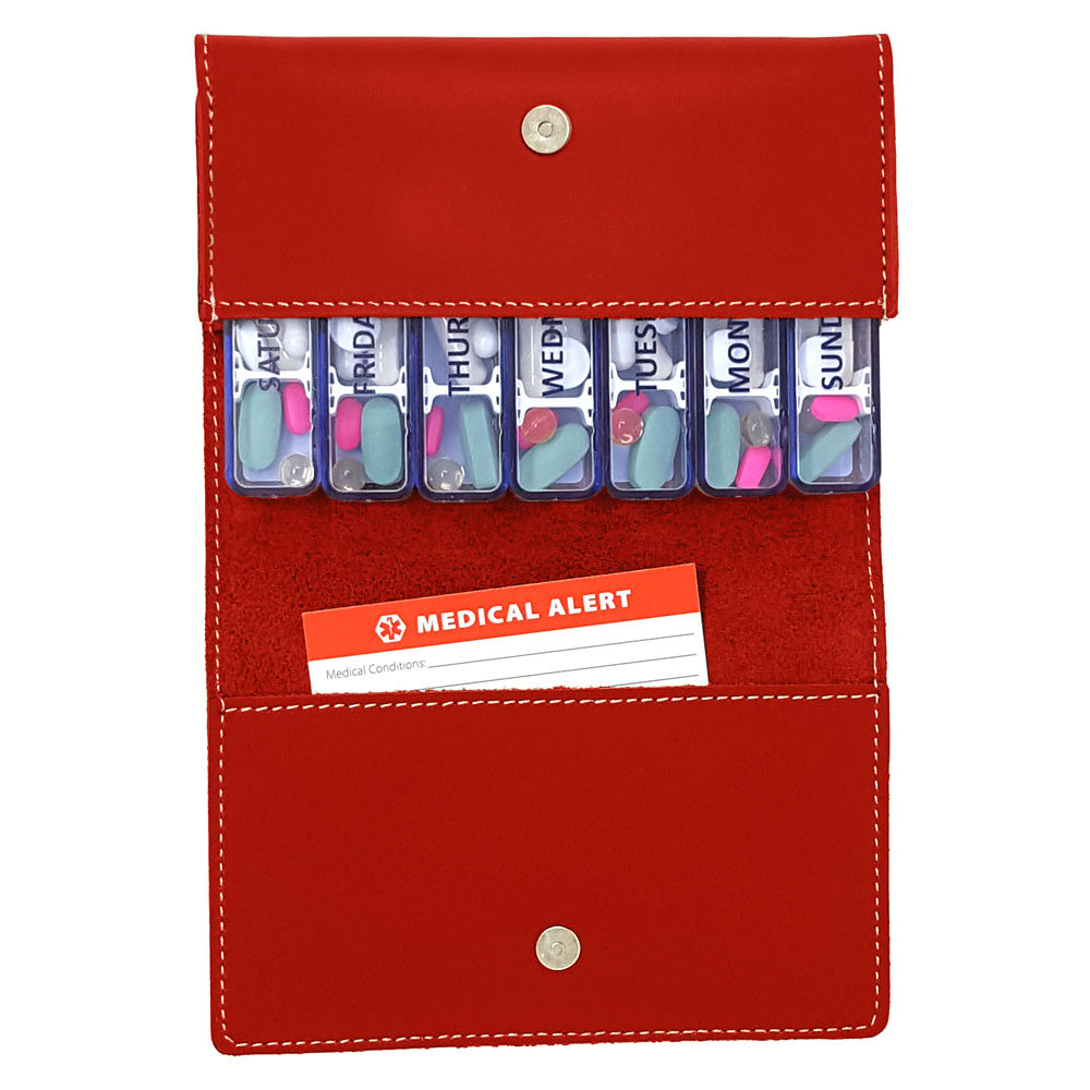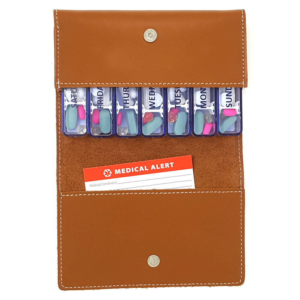 Kibodan Leather Pill Case Wallet - Weekly Pill Organizer with bonus Medical Alert & Contact Information Card