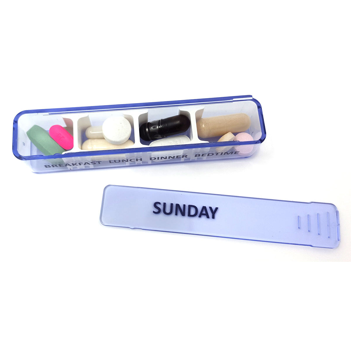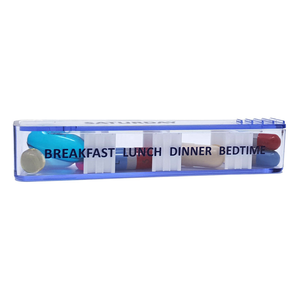 - The top of the pillboxes are marked with a weekday and the front marked Breakfast, Lunch, Dinner, and Bedtime.
