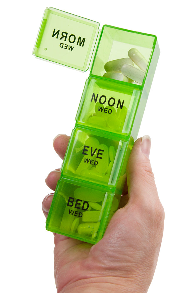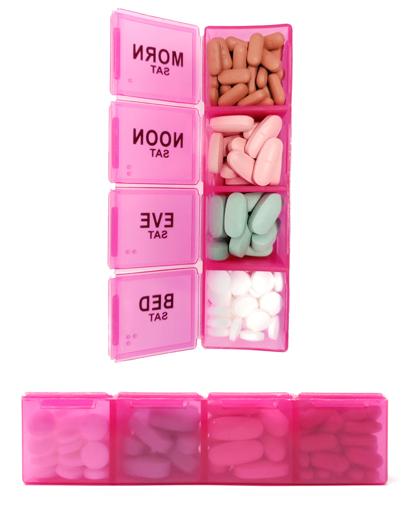 INDIVIDUAL DAILY PILL BOXES Each day’s medications are in their own individual pill box divided into 4 individual compartments. Each lid only opens to reveal the 1 compartment so no issues with accidentally mixing your medications. You have the option to take just one (or more) day’s medications with you.