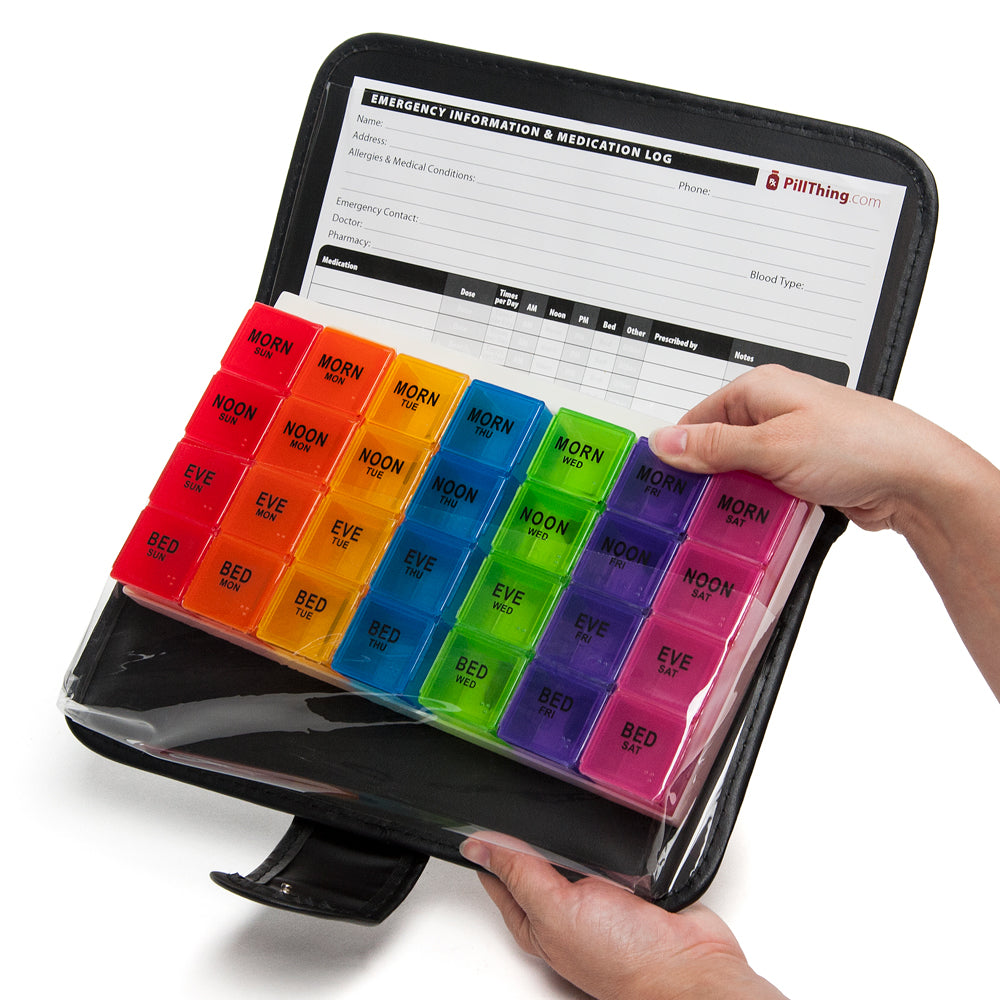 SECURE CLOSURES Pills will be secure! Each individual compartment’s lid has a secure and tight fit, no worrying if you take a day’s medication box with you, the lid will NOT accidentally pop open. Each daily pill box stores neatly in the pill organizer tray. The pill tray stores easily and securely in a clear pocket. And the case has a secure snap closure. Your weeks worth of medications are secure and ready to go!