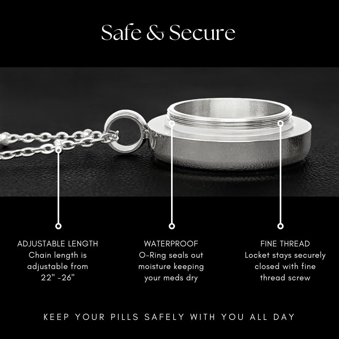 Superior Waterproof Secure Closure The 25mm round pill box locket screws together with a fine threading and has an O-ring which keeps your medication pills and tablets safe from moisture. When you need to take your medicine it will be ready to go inside our elegant pill box necklace.
