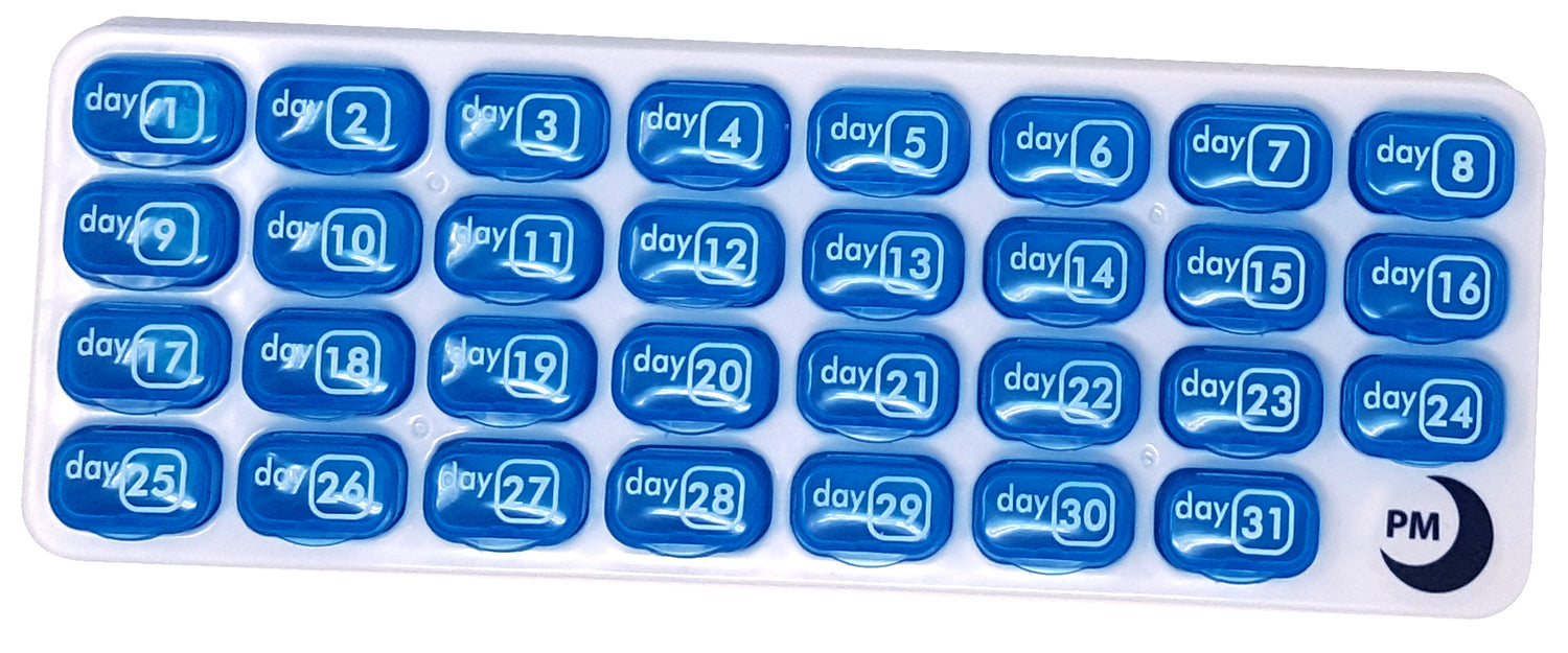 The pods are numbered to correspond to the days of the month on which you need to take your medication. The pods can be kept in the tray or you can pop them out for work or travel.