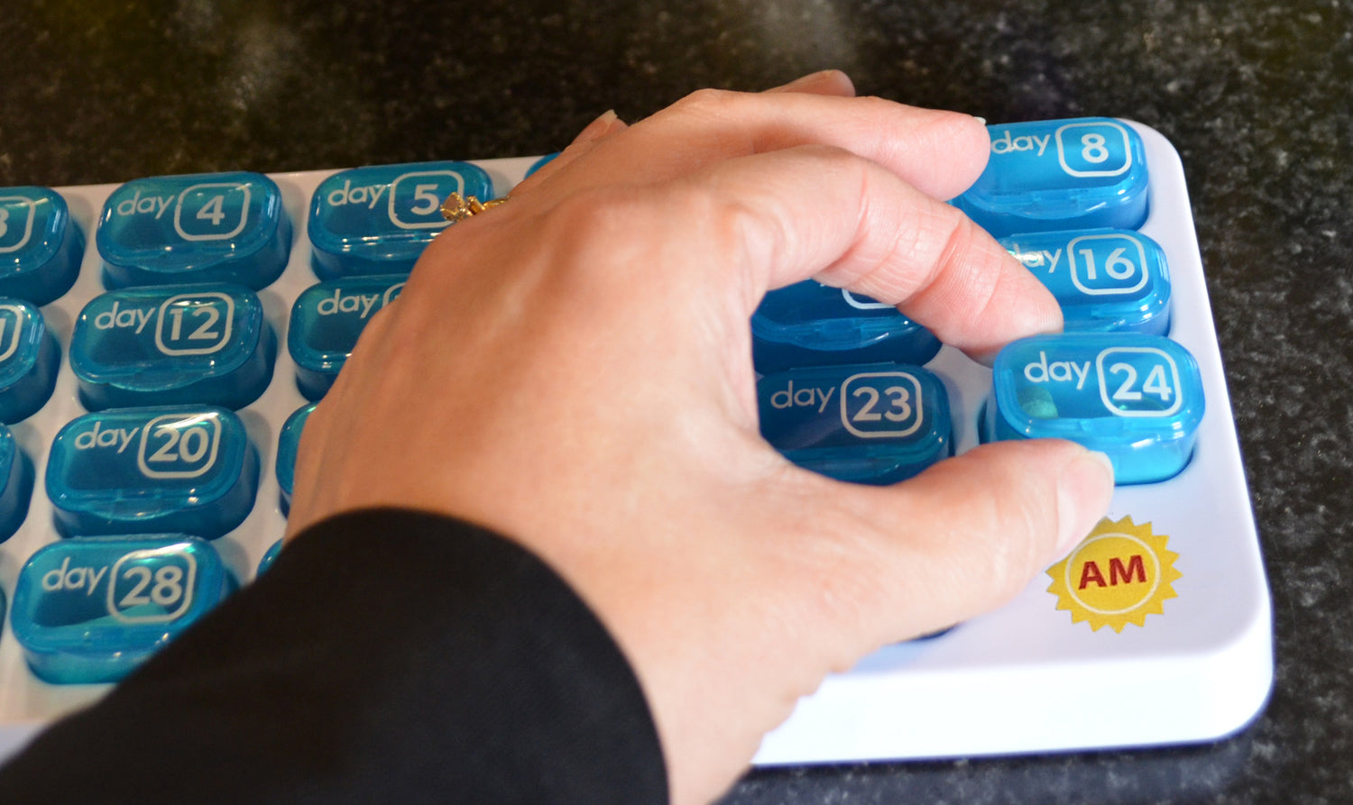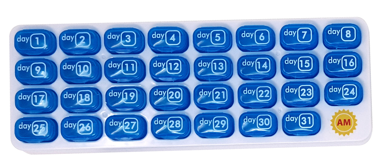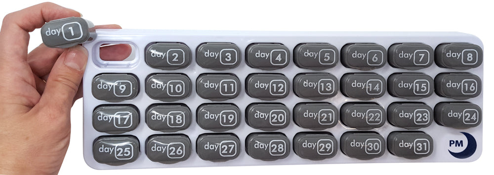 The pods are numbered to correspond to the days of the month on which you need to take your medication. The pods can be kept in the tray or you can pop them out for work or travel.