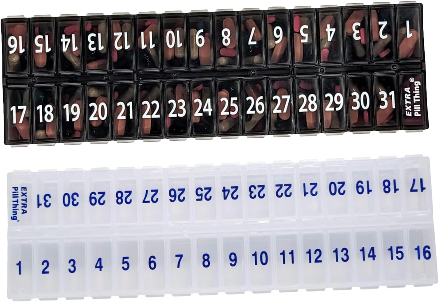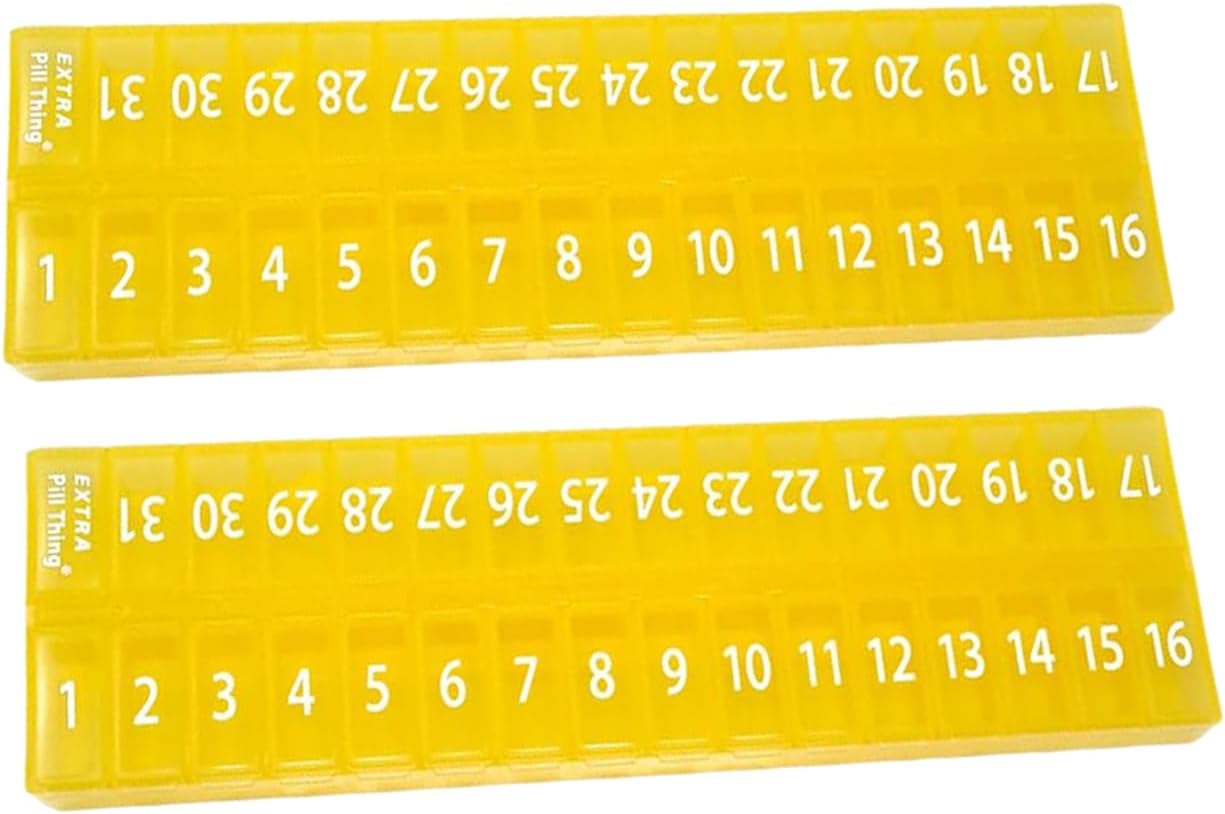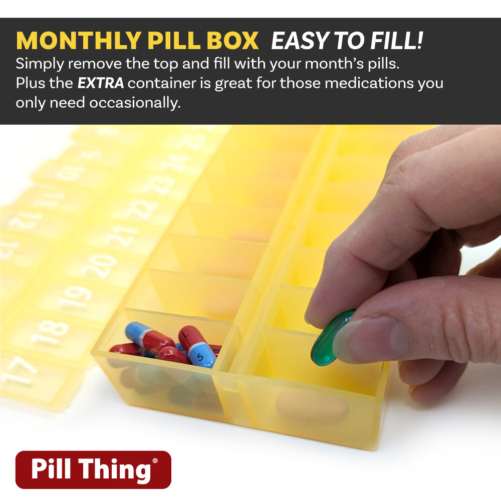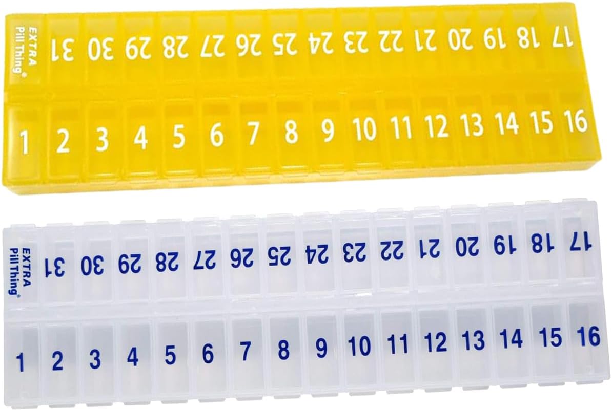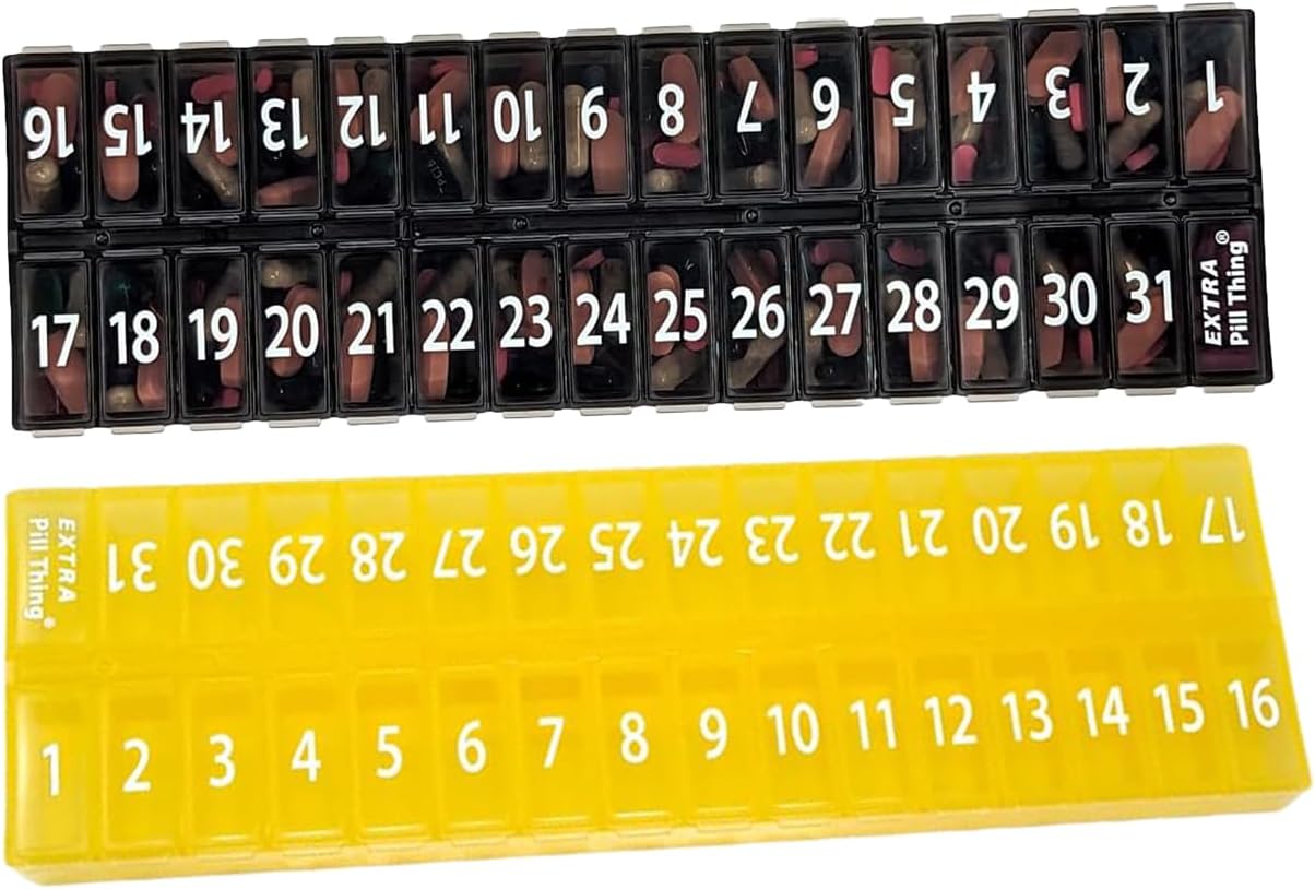 An entire month's AM/PM (or however you choose to use them) medications organized and ready to go! Choose from Clear, Blue, Yellow, Black, Teal, and Purple.