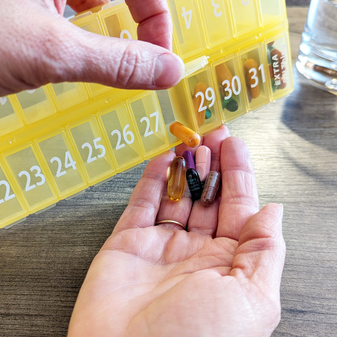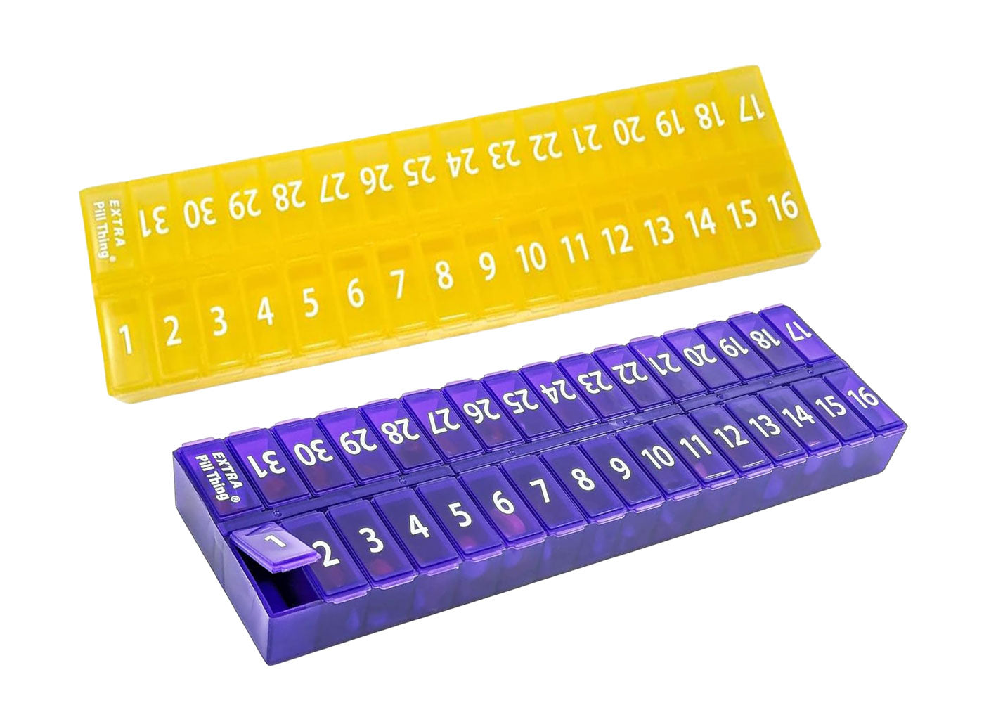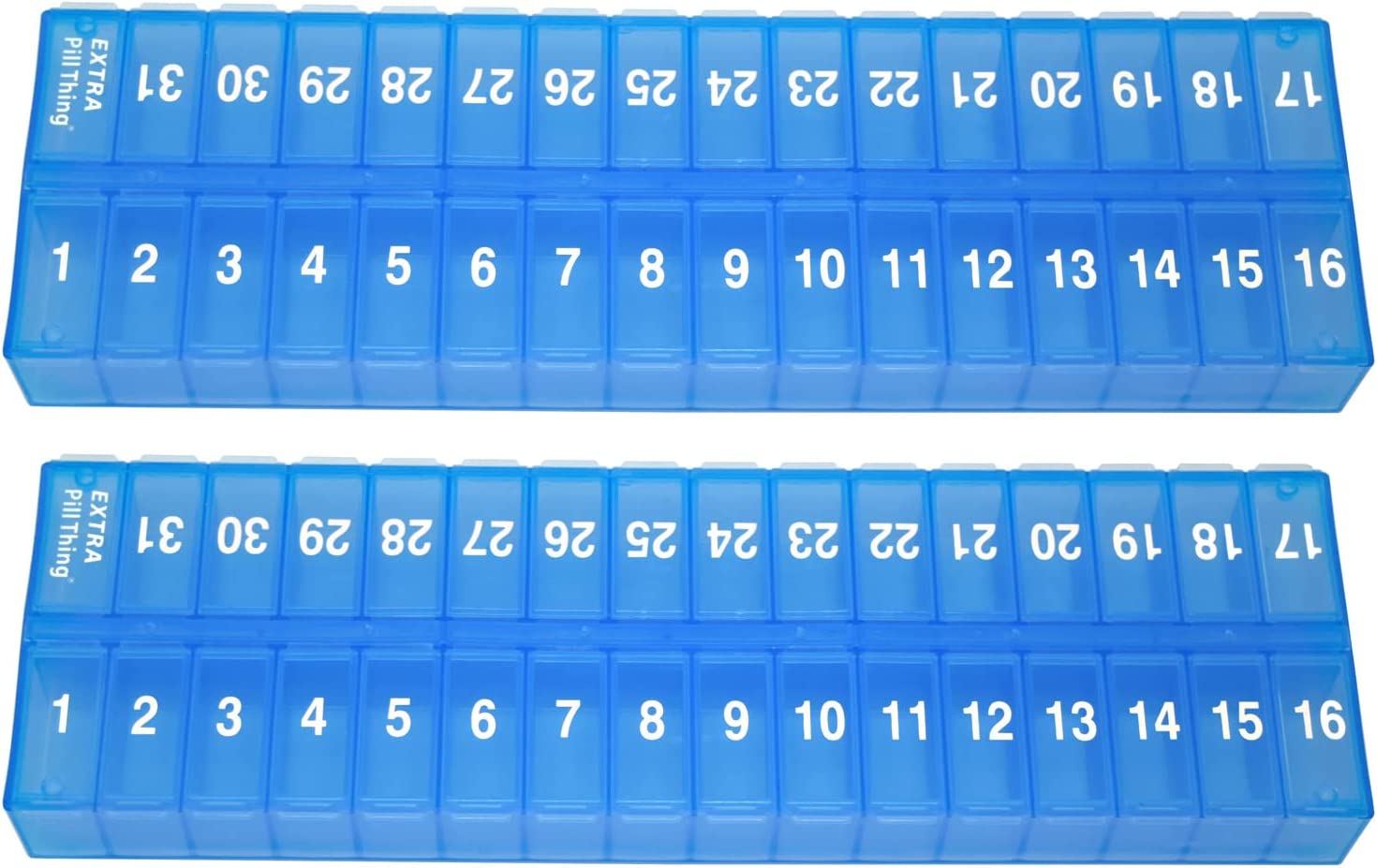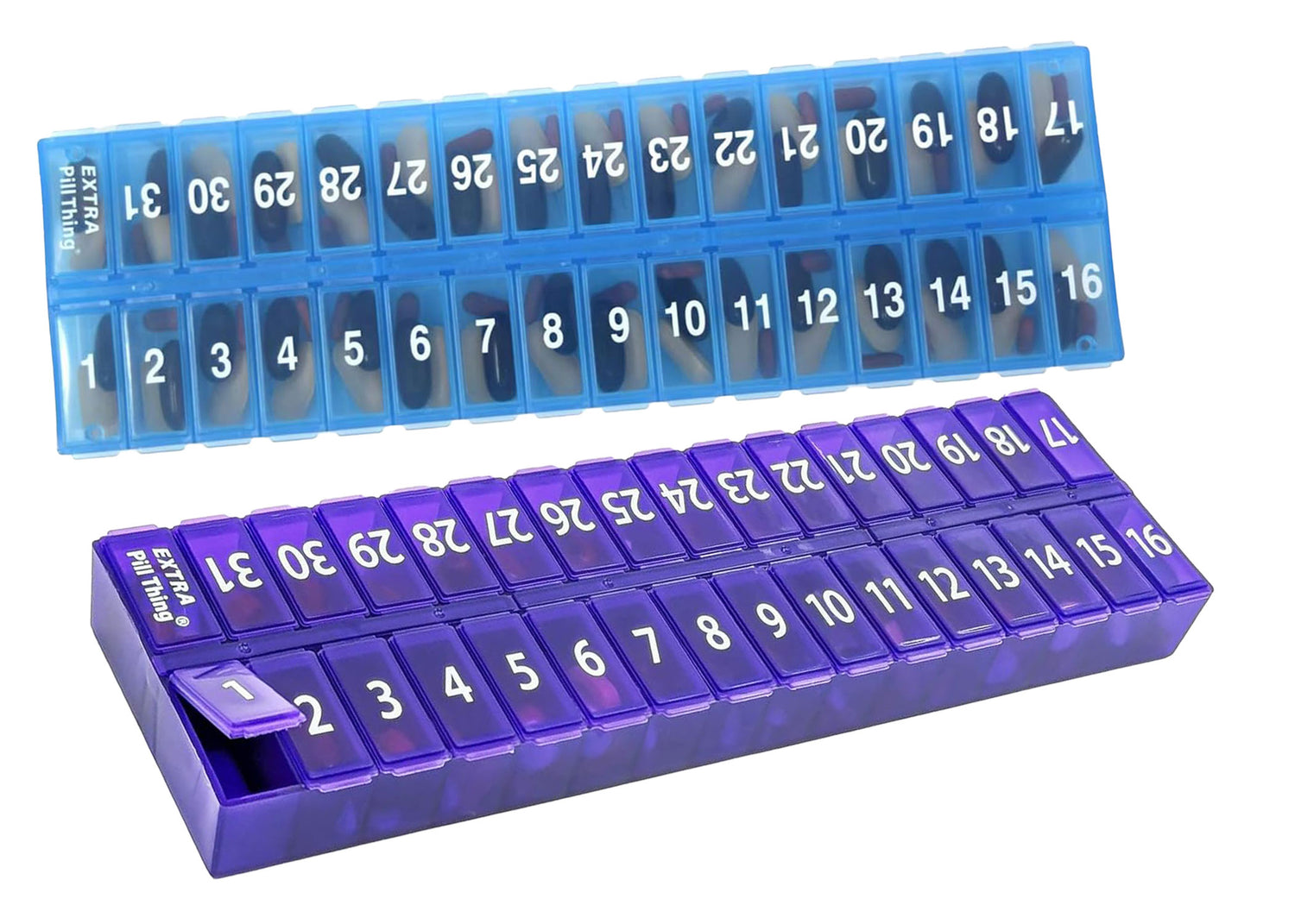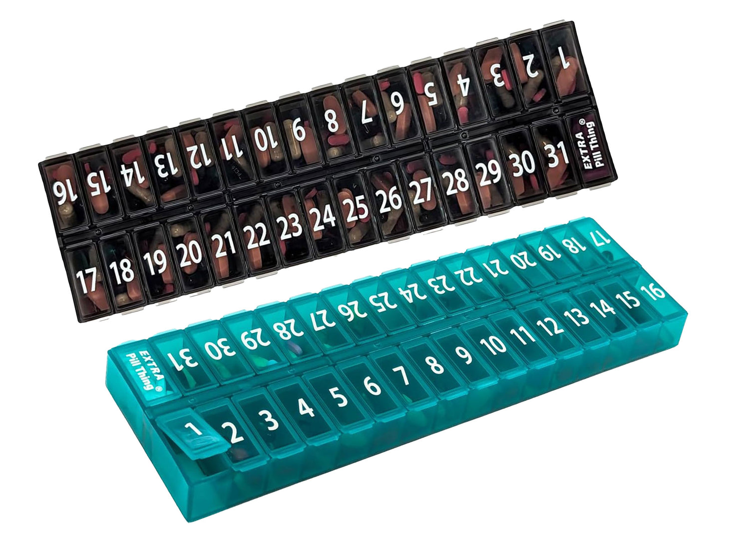 An entire month's AM/PM (or however you choose to use them) medications organized and ready to go! Choose from Clear, Blue, Yellow, Black, Teal, and Purple.