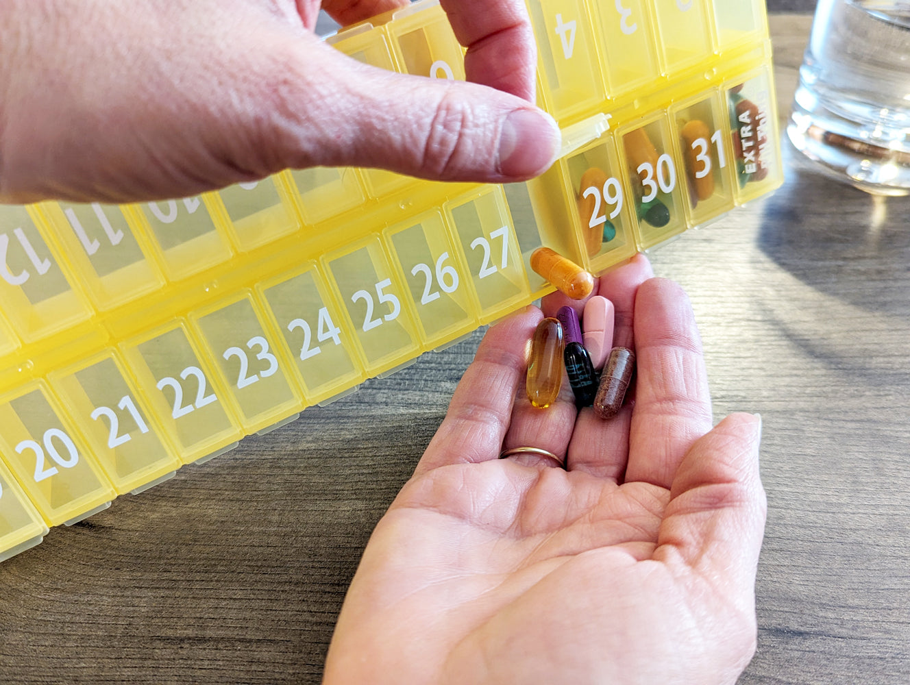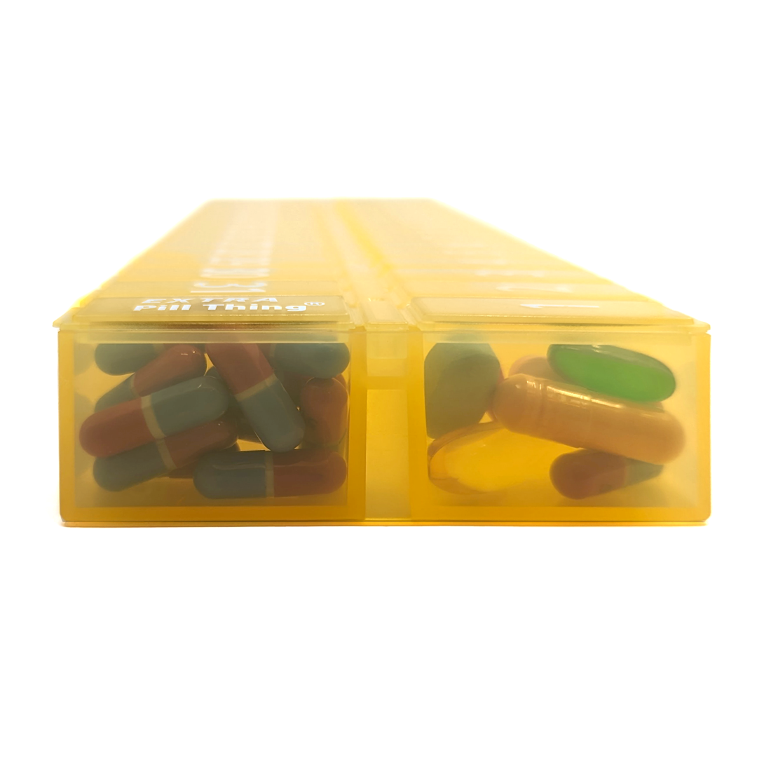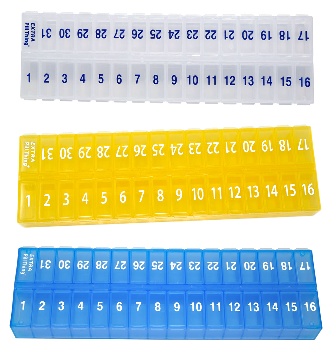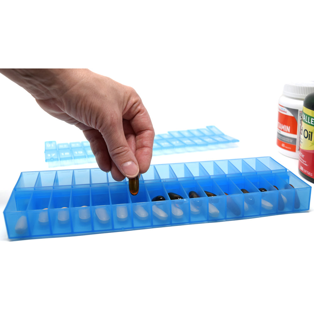 One of our most popular pill organizers. An entire month's medication in one pill organizer! Available in Clear, Blue, Yellow, Black, Teal, and Purple.