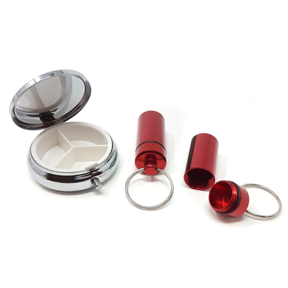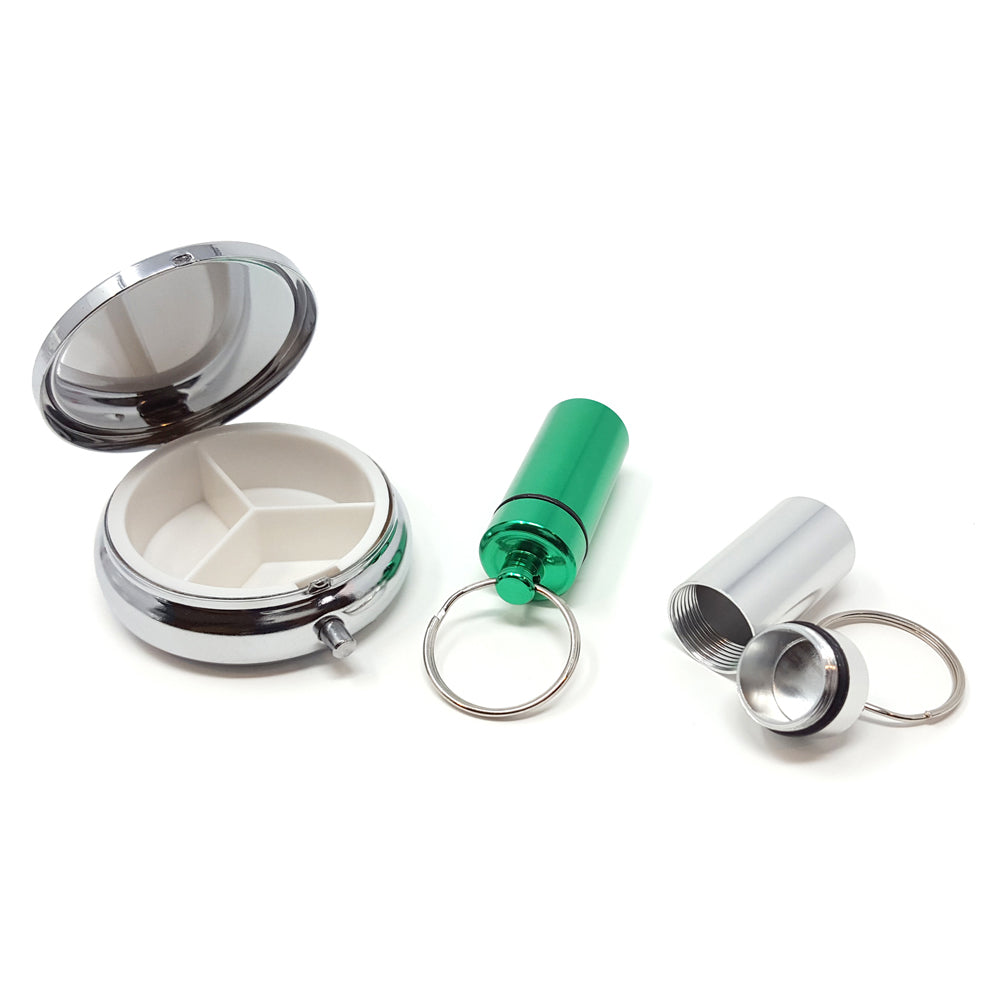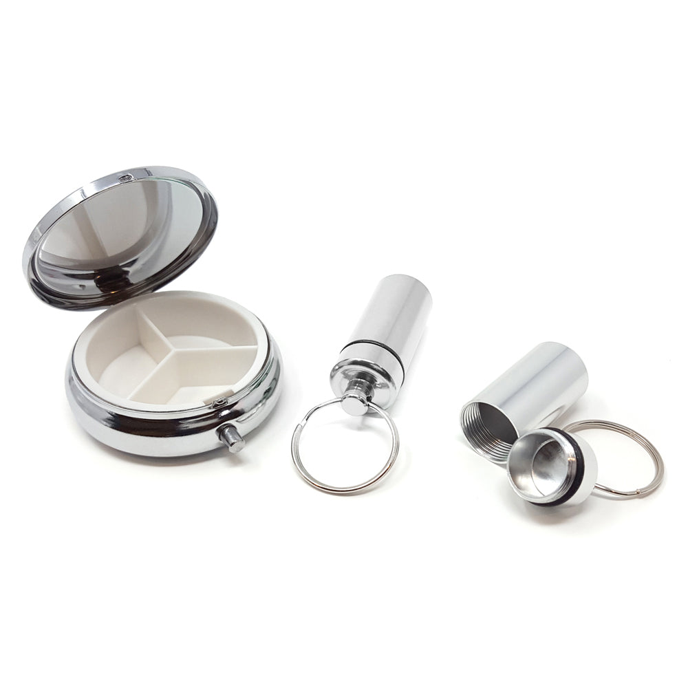 This great set includes our elegant Round Silver Pill Box and 2 of our Key Ring Pill Boxes. The Round Silver Pill Box has three compartments and a push button opening. The Key Rings have a rubber o-ring makes it water resistant. The Silver Pill Boxhas a highly polished lid that you can have your local jeweler engrave a message to someone special.