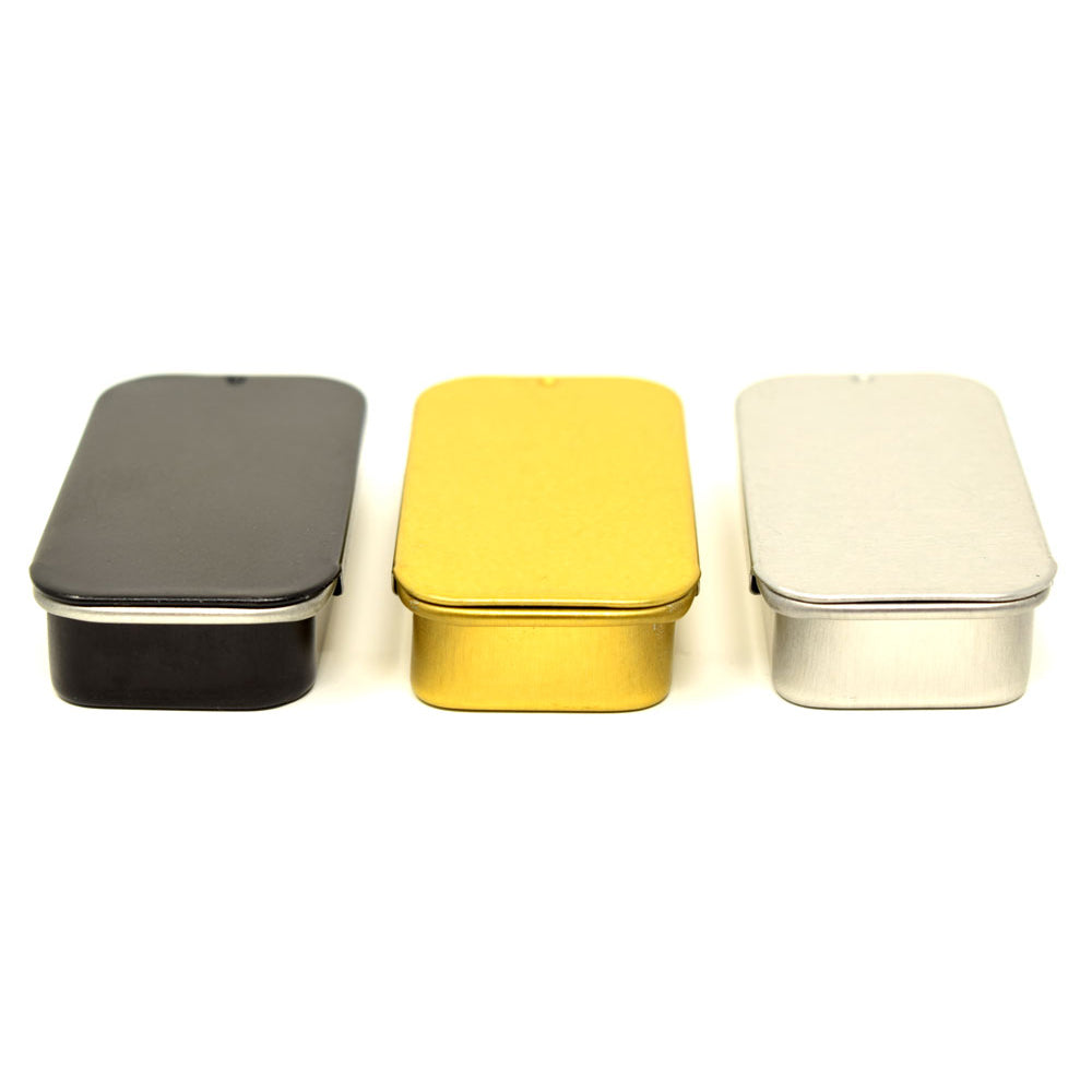 LARGE - 3 3/8" x 2 1/8" x 5/8" - Slider tins do not have an internal plastic lining, therefore caustic substances may cause the steel to rust.