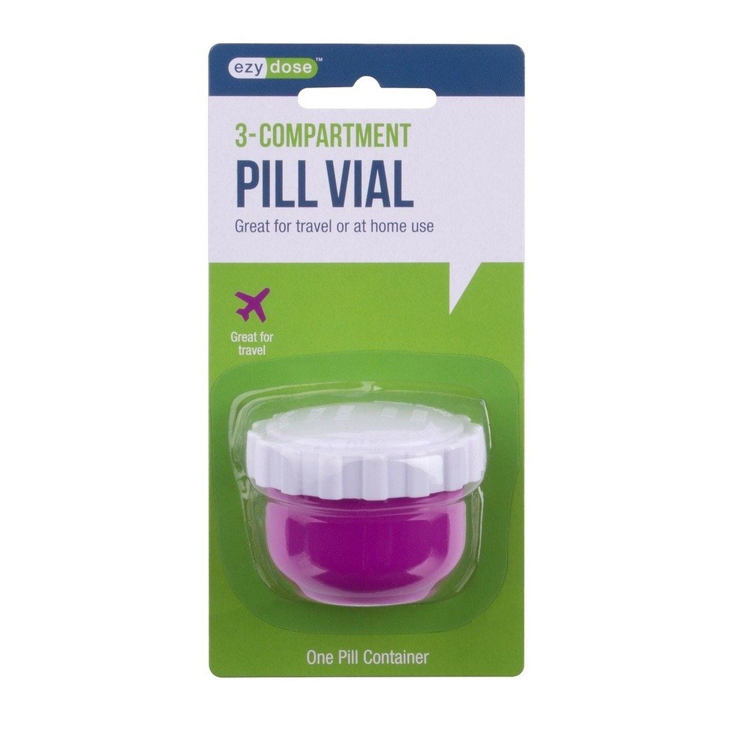 - Round travel vial lets you carry 3 different types of pills
