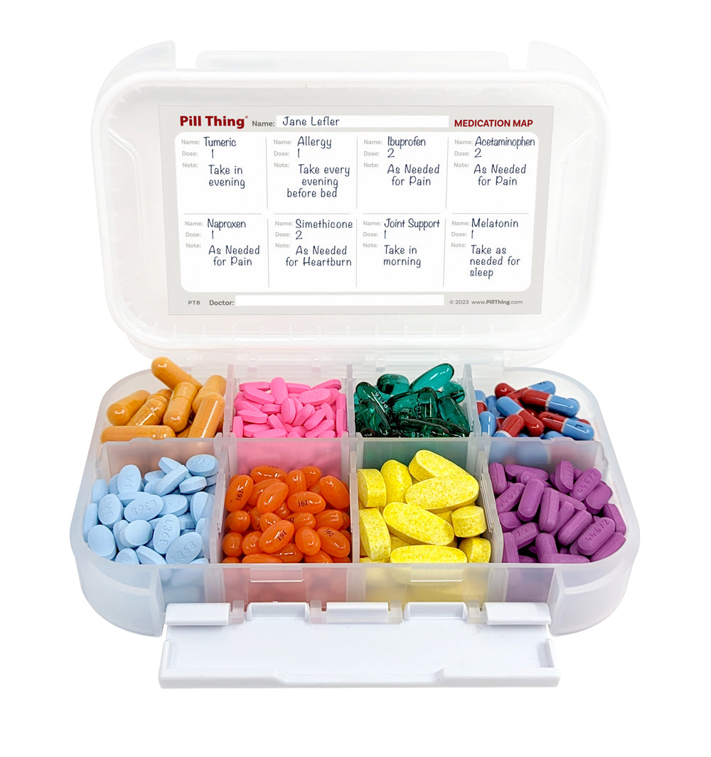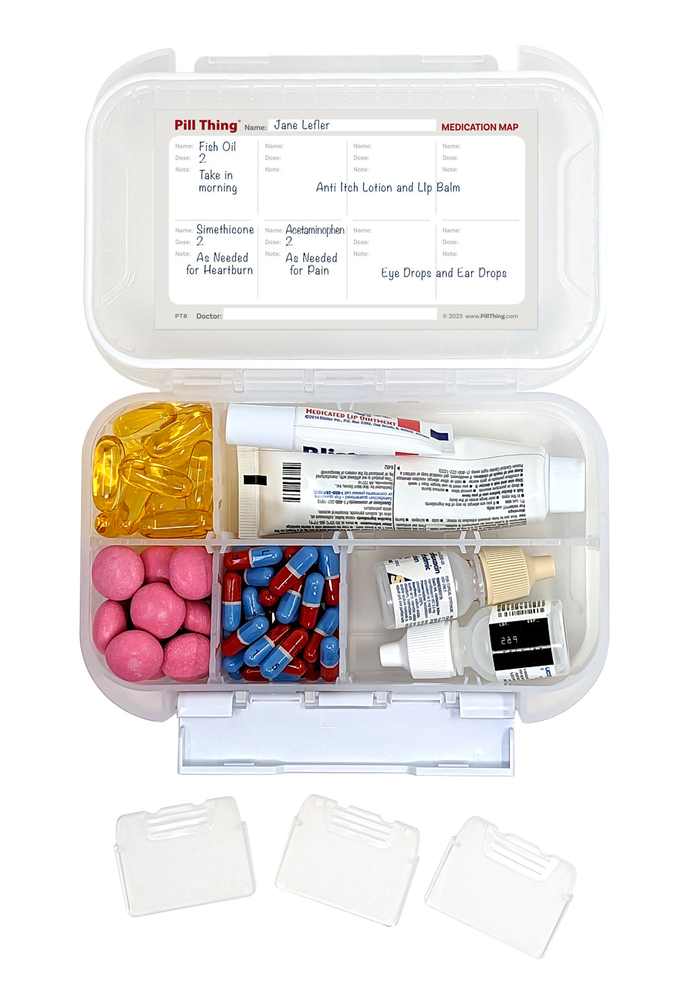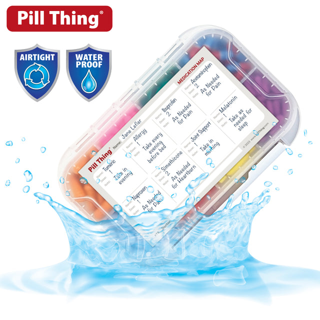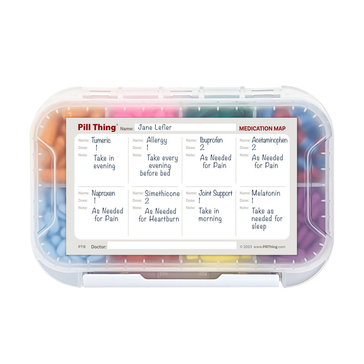 - Medication Map - We include a sturdy medication map so you can write in the med name, dosage and any other important information regarding the pill or tablet. You can tape it to the top of the lid or just lay inside the container. On the back side you can keep important contact info of your doctors, insurance etc. and it also includes an area for additional notes.