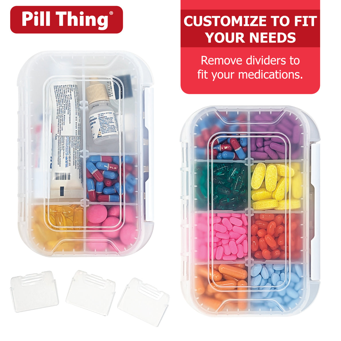 - Great for Travel - Keep all your pills organized and in 1 container and then when you are ready to go just drop in your suitcase, luggage or bag. Product Dimensions – Overall: 6.7″ x 4.5″ x 1.5″; Approximate Individual Compartment Size with all Dividers Installed: 1.5″ x 1.75″ x 1.25″ Deep