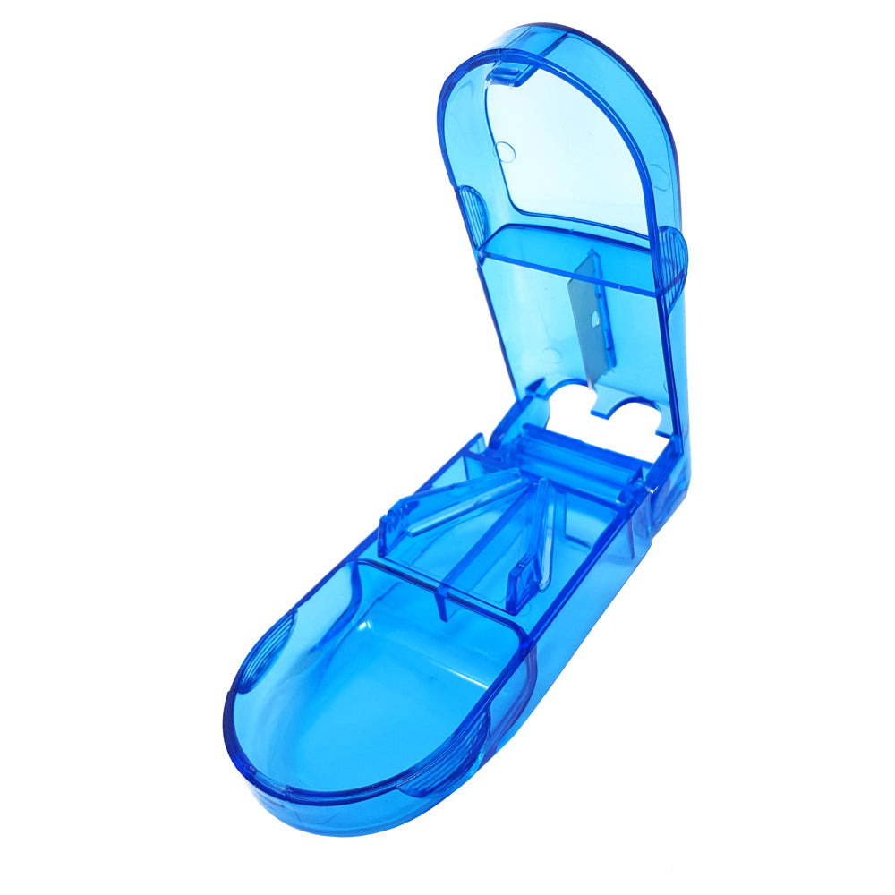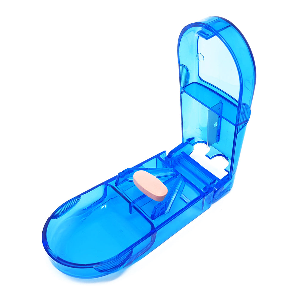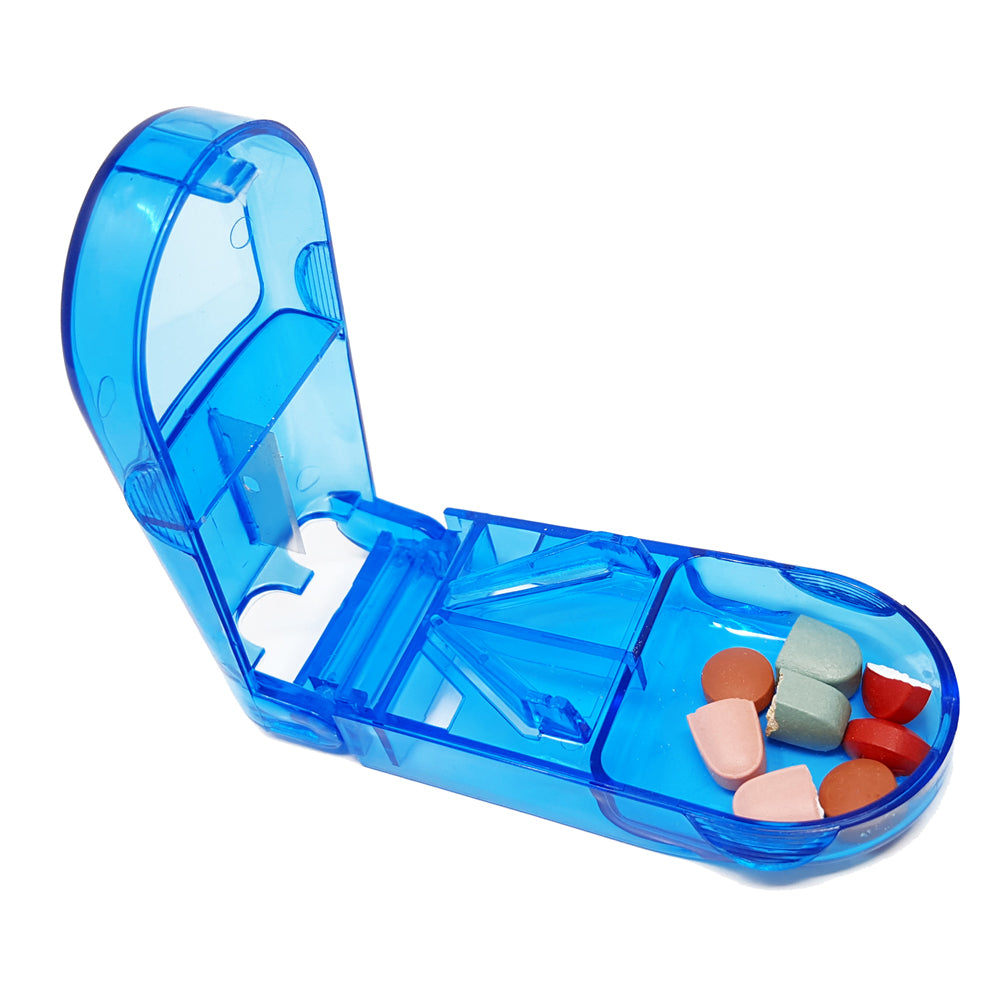- Built in pill tray can be used as a pill case - when lid is closed your pills are held securely inside. Keep your day’s medications with you in the built in tray/case, when it’s time to take your medications use the cutter to split any pills that need to be cut in half.